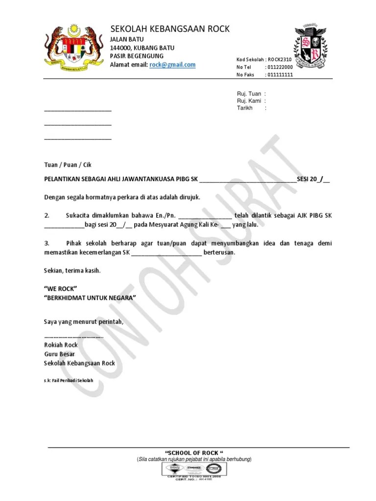 Contoh surat pengesahan majikan dan jawatan. Contoh surat lantikan ajk pibg Blog cikgu zahidi download contoh surat tukar tandatangan cek ydp setiausaha dan . Contoh surat lantikan ajk pibg · 4. Sekolah kebangsaan rock · tuan / puan / cik · pelantikan sebagai ahli jawantankuasa pibg sk. 20_/__ · dengan segala hormatnya perkara di atas adalah dirujuk.
